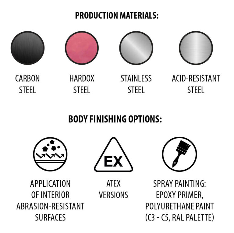 Stainless steel versions are most often used in light industry – in the food, chemical, cosmetics and similar industries. Different variants of hoppers allow for correct operation with materials that are theoretically difficult to dose – highly abrasive, easily aerated, with a tendency to uncontrolled flow or clumping.
