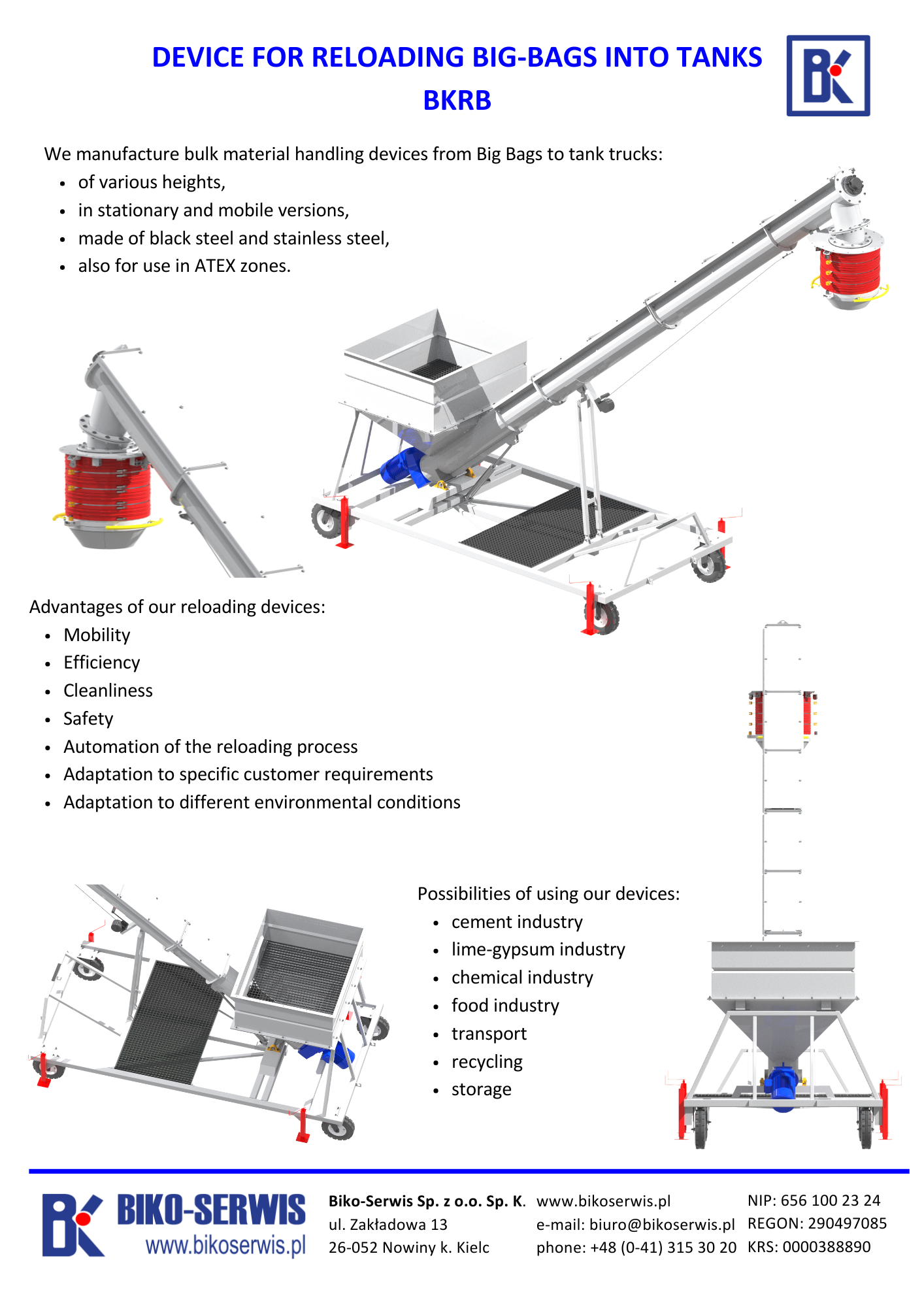 Reloading bulk materials from Big Bags to tank wagons is an important process in the cement, lime-plaster, chemical, food industries, as well as in companies dealing with transport, recycling or storage. Thanks to our BKRB reloading equipment, this process can be significantly facilitated and accelerated.
