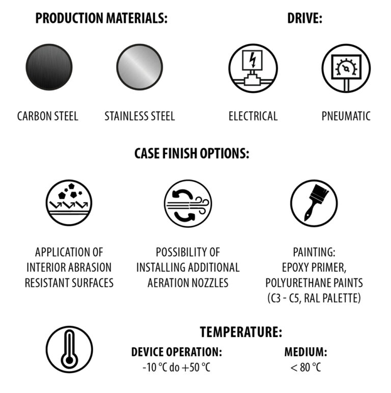 To minimize the impact of product accumulation, all types of mechanical deagglomerators are used, as well as vibrating bottoms equipped with special motovibrators or vibrating hammers. It is possible to install an additional fluidization/aeration system for the material. The use of additional aeration nozzles on the vibrating bottom cone is recommended especially during longer technological breaks when the material needs to be deaerated and in the case of powdered materials such as flour, lime, gypsum or hydrated lime.