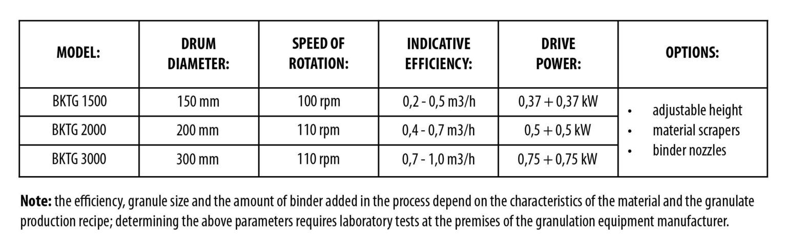 Note: efficiency, granule size and binder content depend on the characteristics of the material and recipe. Their determination requires laboratory tests at the manufacturer’s place.