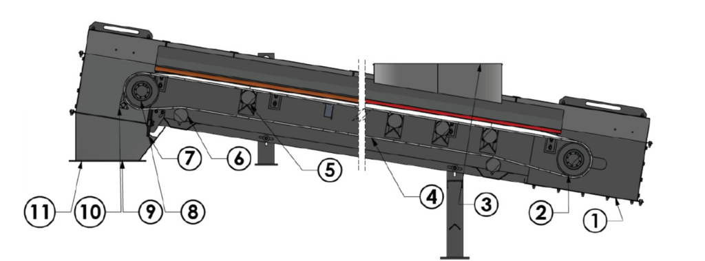 1 – stacja cofania, 2 – bęben cofania, 3 – wlot, 4 – pas, 5 – górny wałek nośny, 6 – dolny wałek nośny, 7 – skrobak, 8 – bęben napędowy, 9 – stacja napędowa, 10 – skrobak, 11 – wylot