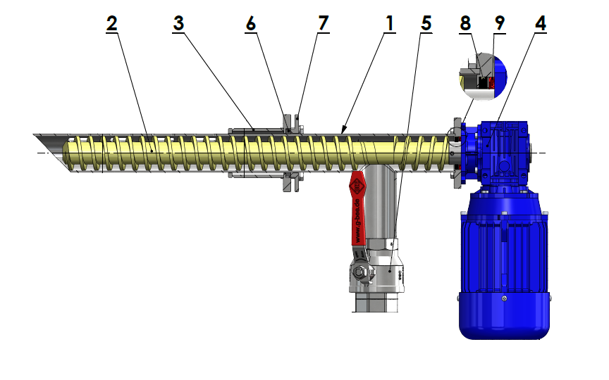 1 – korpus, 2 – wał śrubowy, 3 – króciec montażowy, 4- napęd, 5 – zawór kulowy, 6 – uszczelka dławnika, 7 – dławnik, 8 – pierścień uszczelniający filcowy, 9 – pierścień uszczelniający NBR