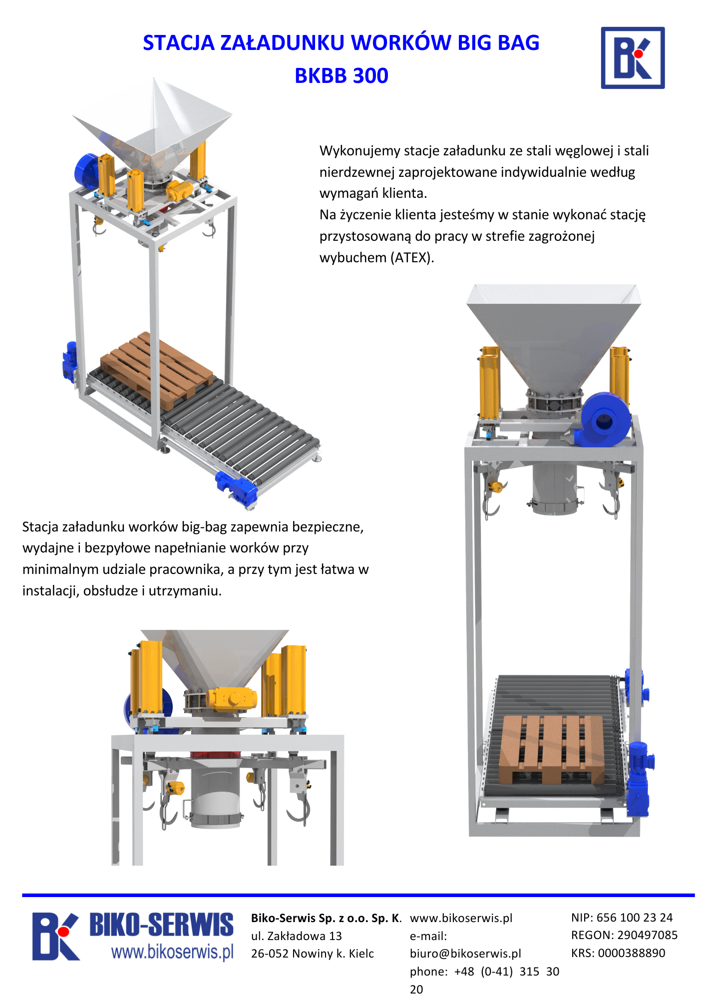 Stacja załadunku worków wielkogabarytowych Big-Bag BKBB 300 zapewnia bezpieczne, wydajne i bezpyłowe napełnianie worków materiałem sypkim lub granulowanym przy minimalnym udziale pracownika, a przy tym jest łatwa w instalacji, obsłudze i utrzymaniu.