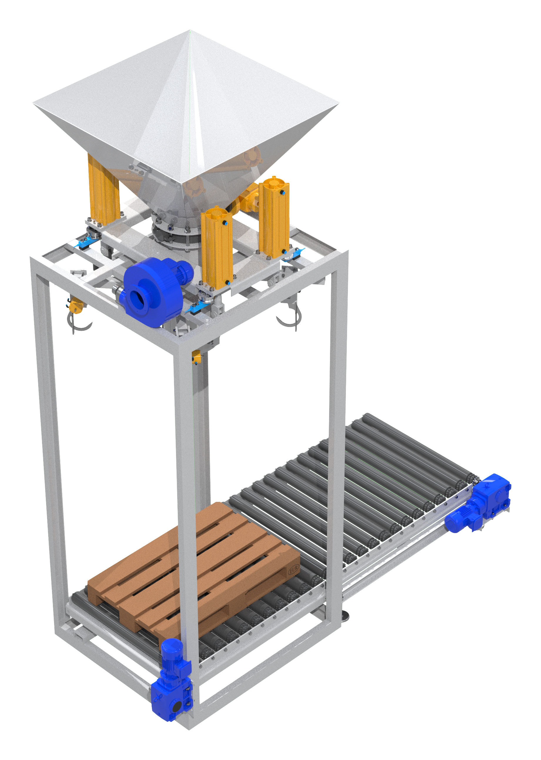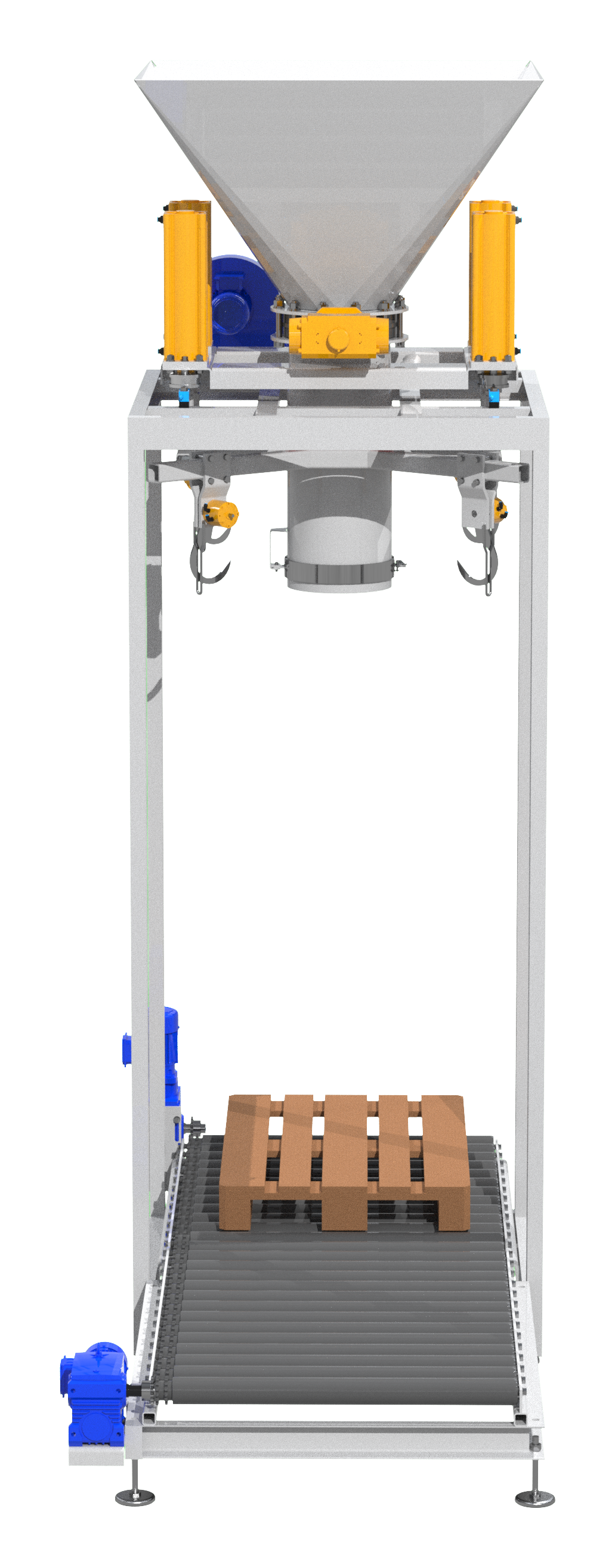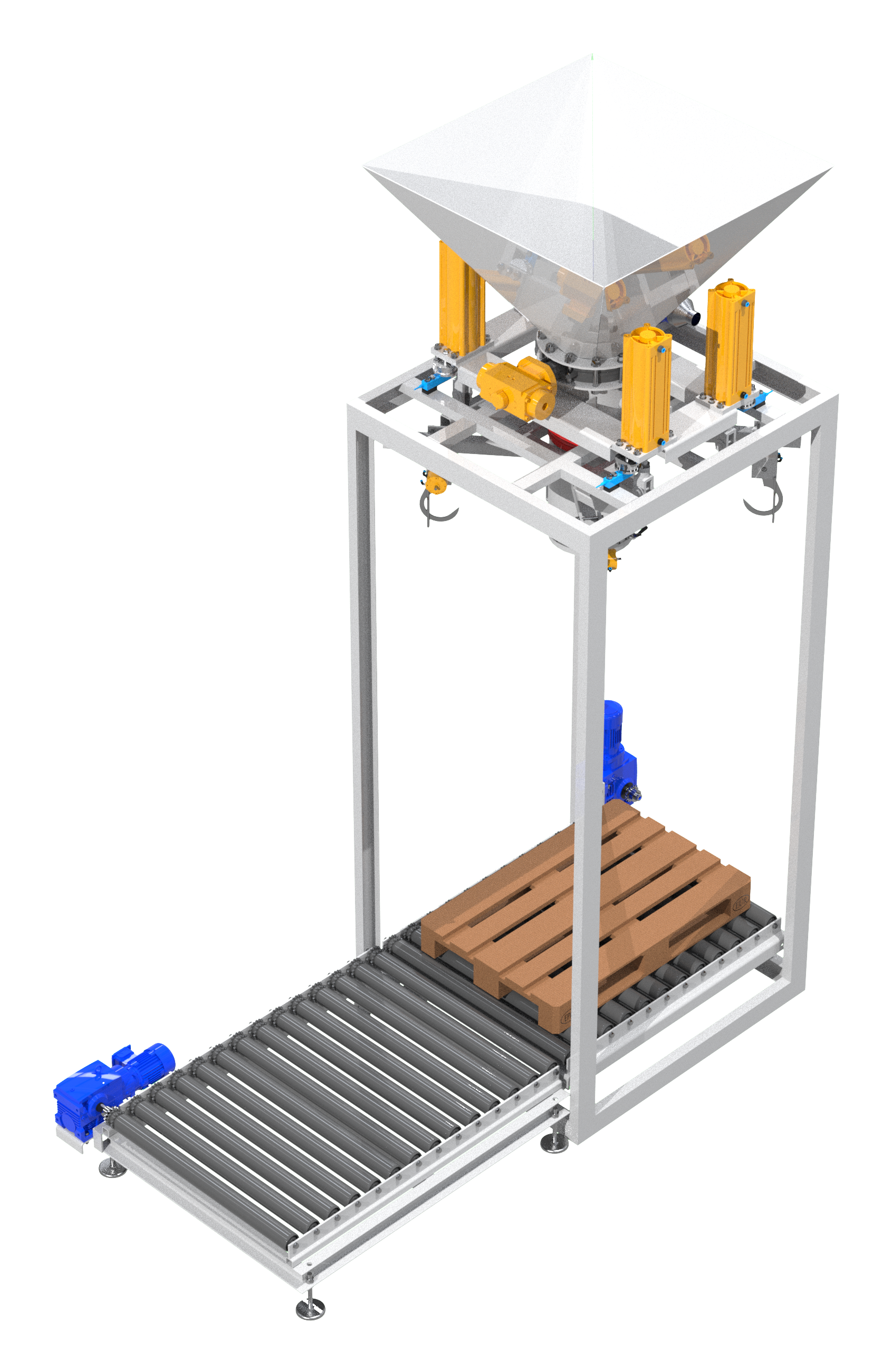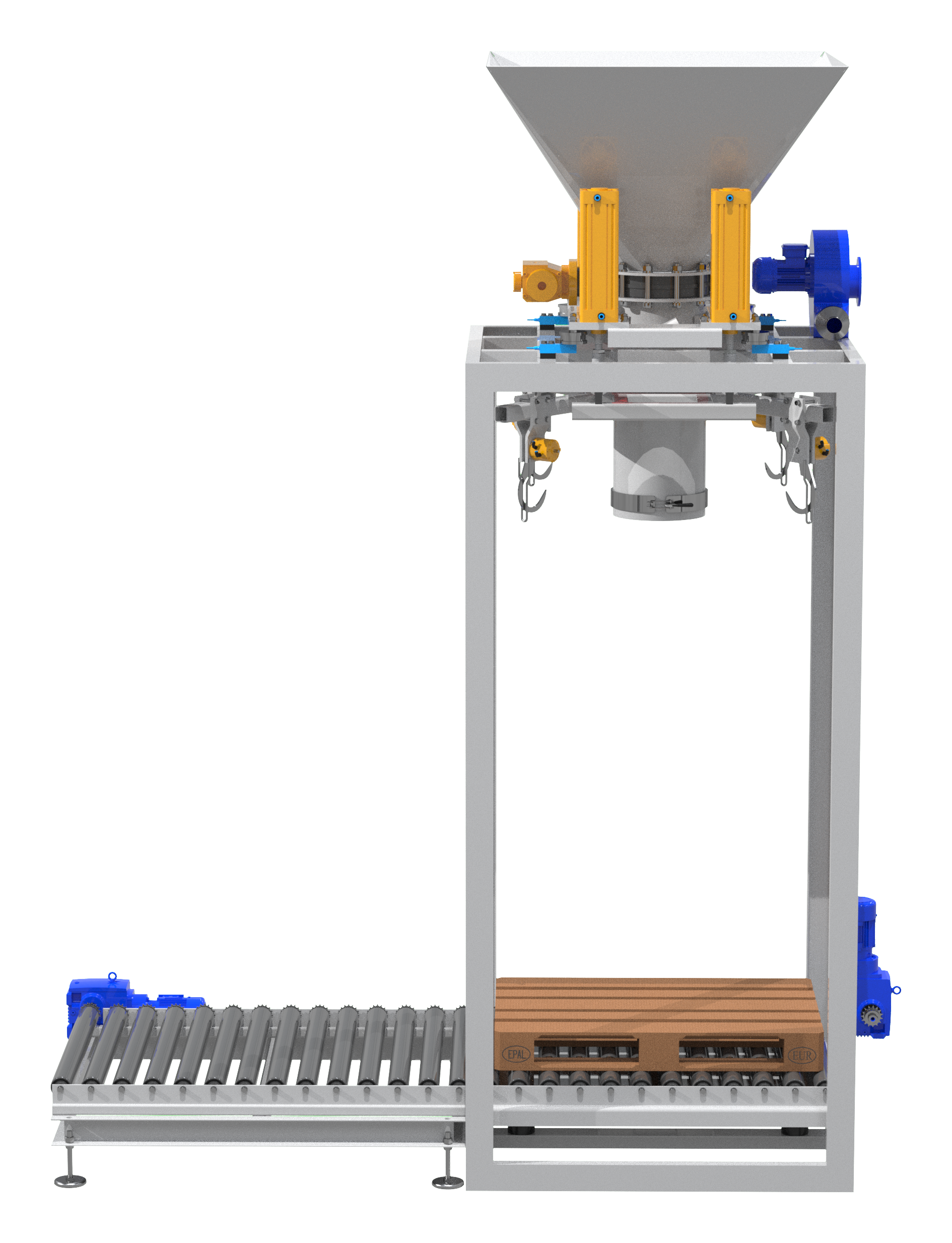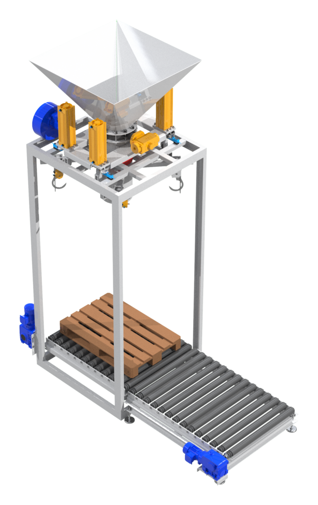 Pusty worek FIBC zaczepiany jest na czterech nastawnych i obrotowych hakach umieszczonych na ruchomym trawersie. Dzięki zastosowaniu automatycznego systemu podnoszenia haków załadunek może odbywać się do worków o różnych rozmiarach. Wlot worka naciągany jest na rurę załadunkową urządzenia, a szczelne połączenie między nimi zapewnia bezpyłową pracę. Następnie rozpoczyna się proces napełniania worka. Stacja wyposażona jest w elektrowibrator odpowiedzialny za wspomaganie rozładunku materiału poprzez jego zagęszczenie, czujniki tensometryczne zapewniające pełną kontrolę nad ilością załadowanego materiału oraz układ ważenia. Na dole znajduje się przenośnik taśmowy z paletami. Po napełnieniu haki automatycznie odpinają worek, który zostaje umieszczony na palecie i wyjeżdża spod rury załadunkowej. Następnie zabierany jest wózkiem widłowym do miejsca docelowego.