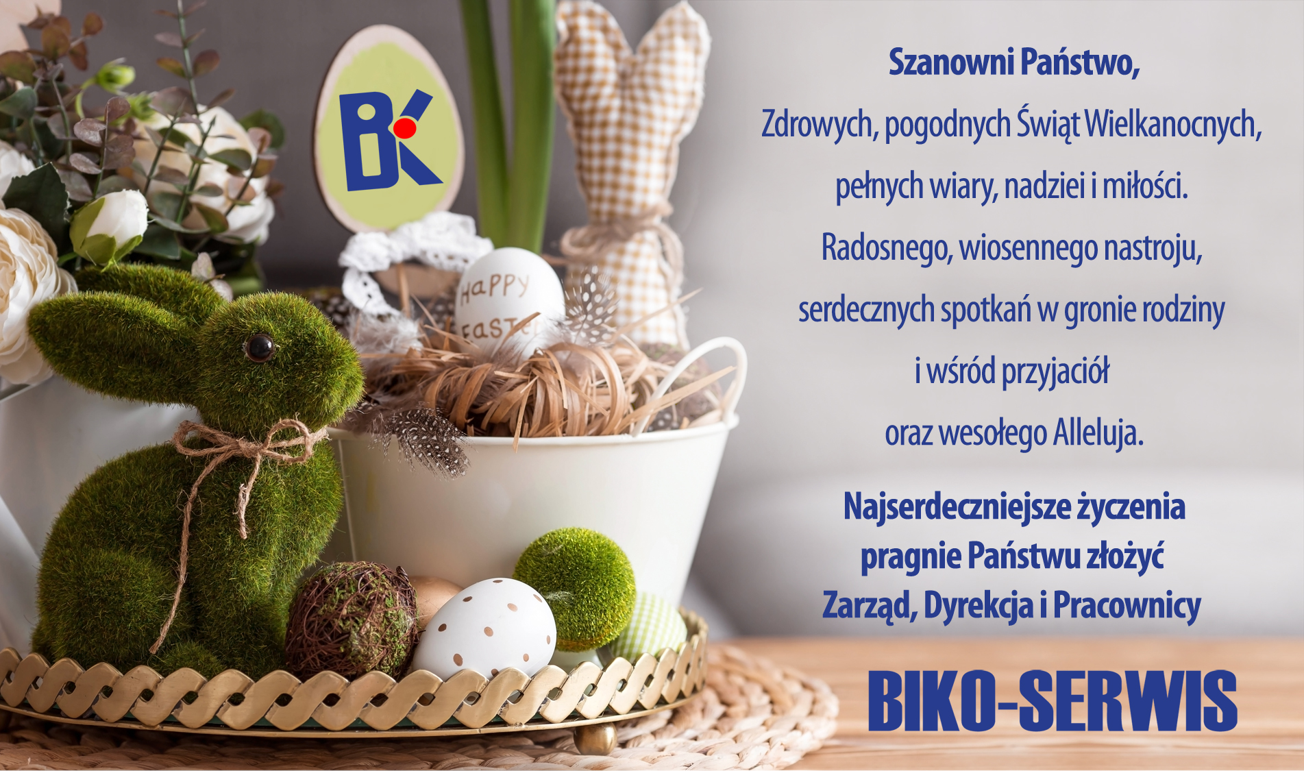 Niech te Święta Wielkanocne będą pełne uśmiechu, radości i miłości rodzinnej. Oby przyniosły zdrowie, szczęście i wspólne chwile pełne ciepła. Wesołej Wielkanocy życzy Zarząd, Dyrekcja oraz pracownicy Biko-Serwis.
